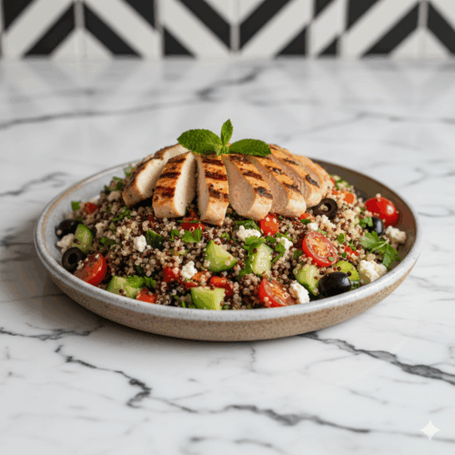 A vibrant, healthy Mediterranean quinoa salad packed with veggies, herbs, and perfectly grilled chicken. Full of protein, fiber, and flavor.